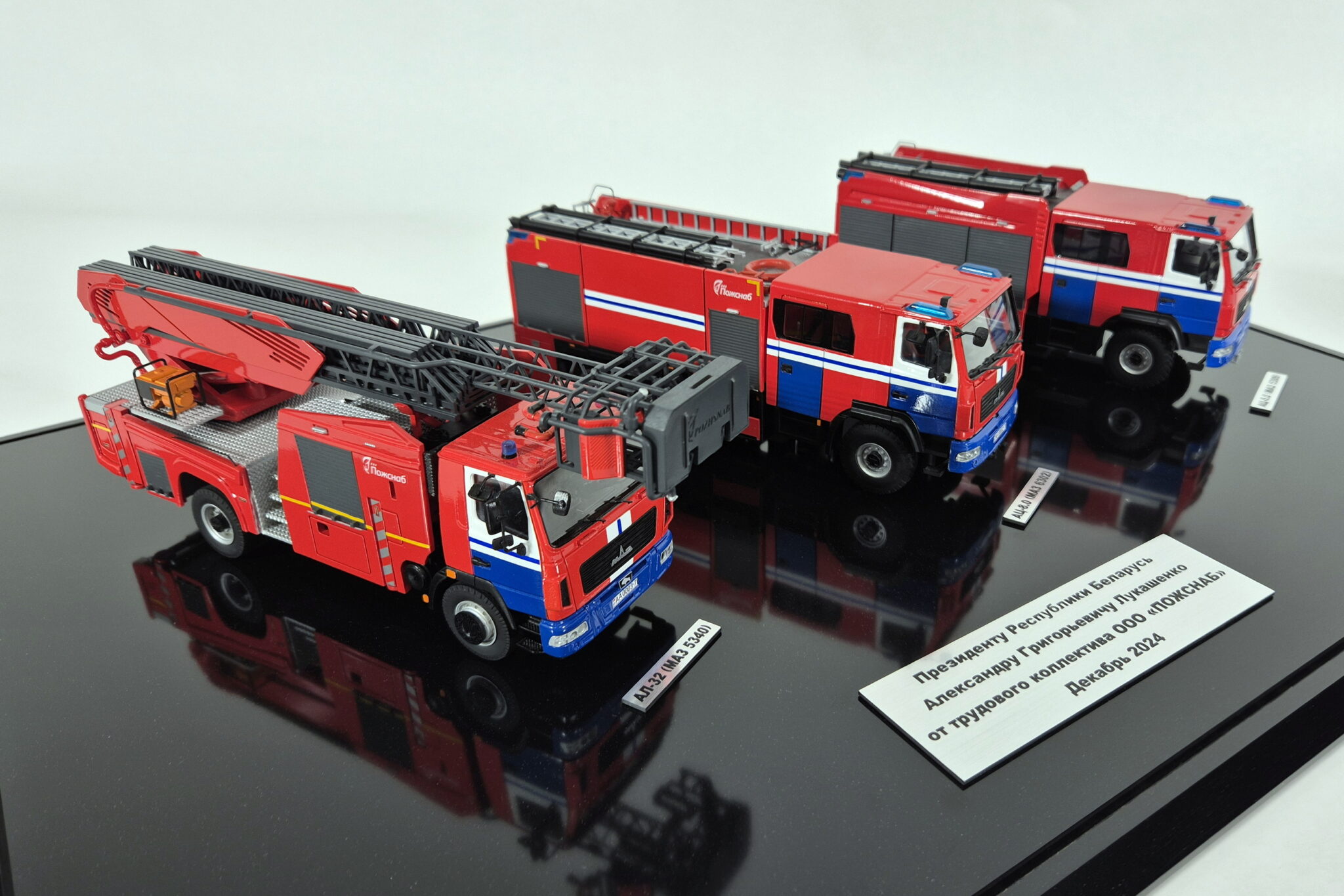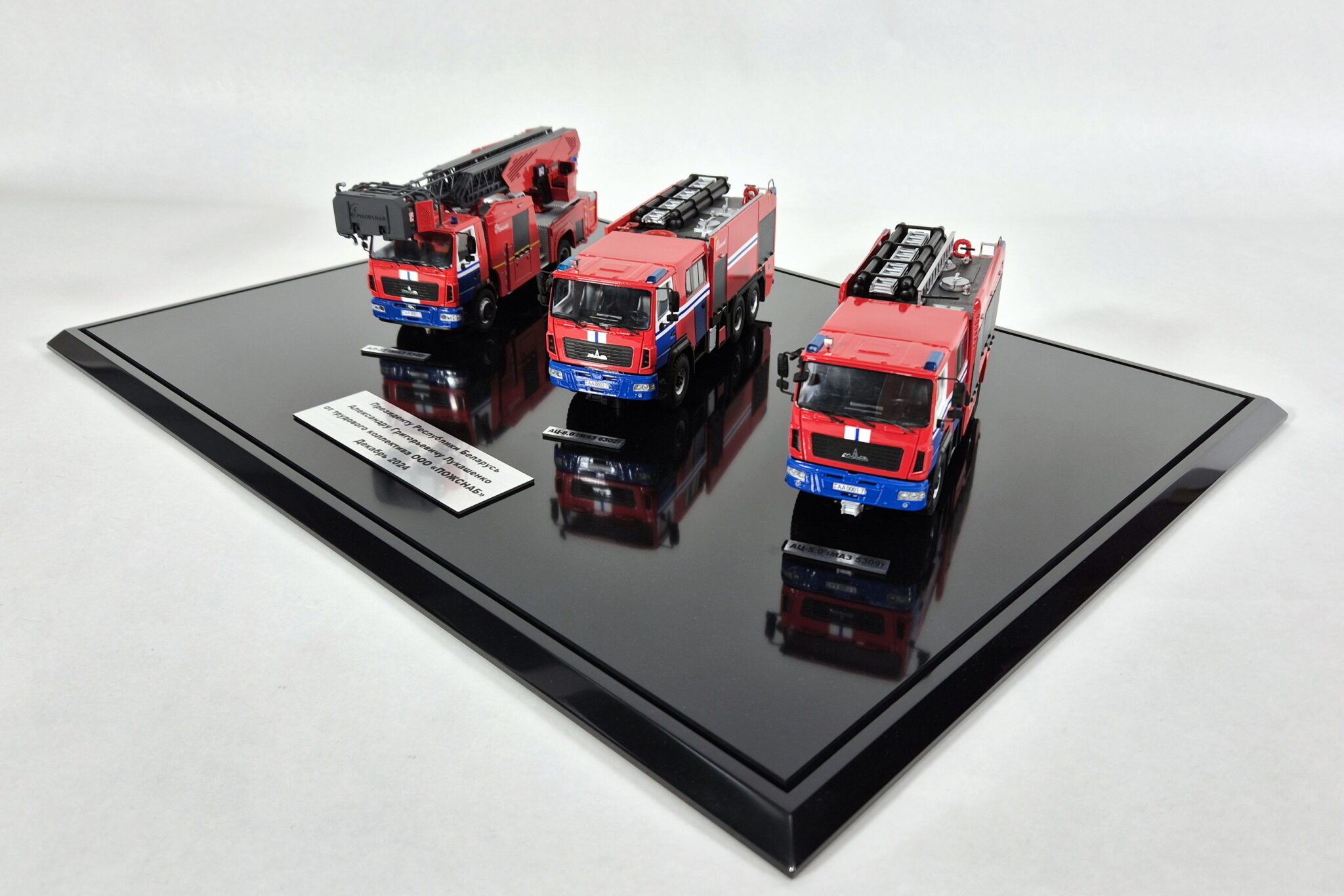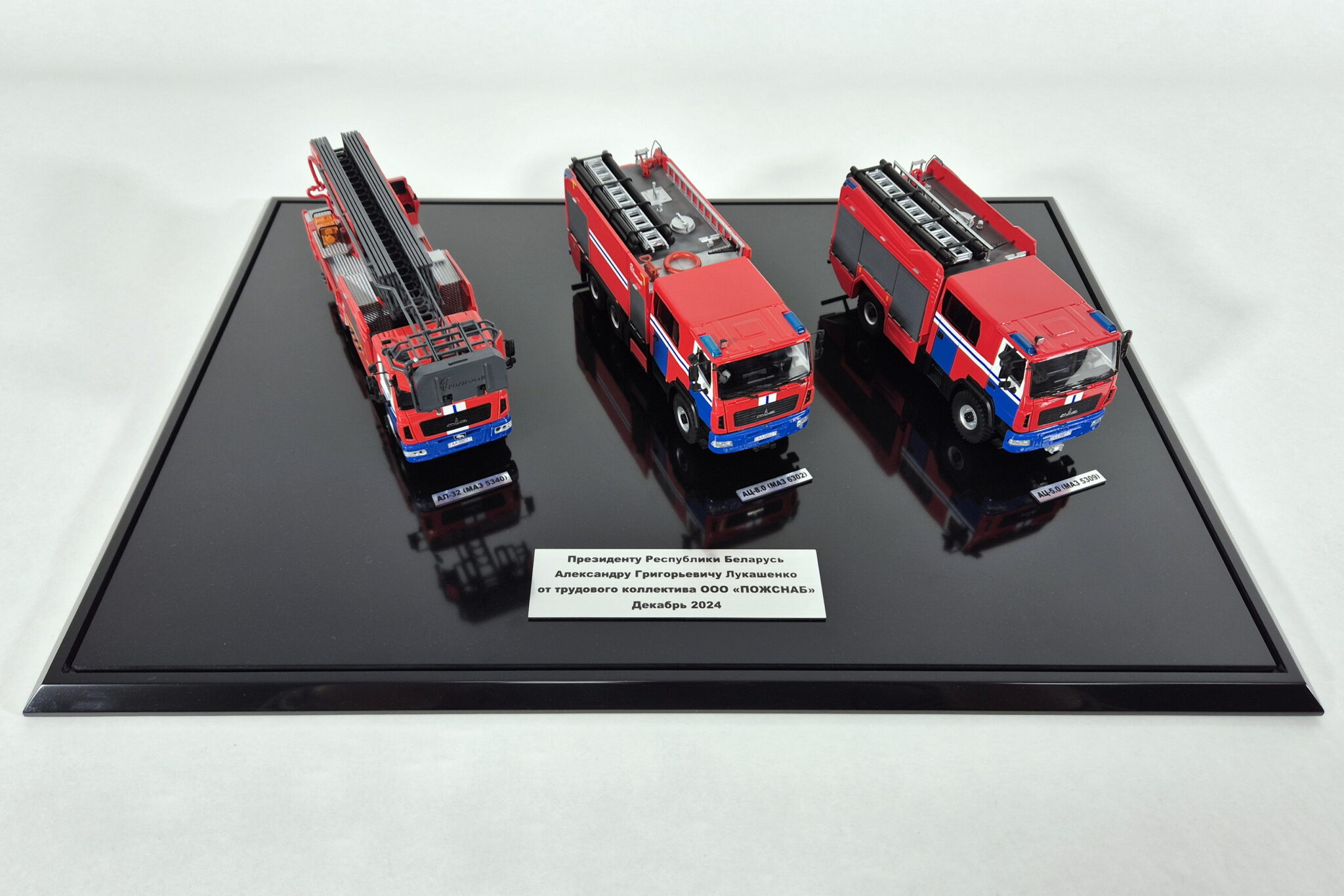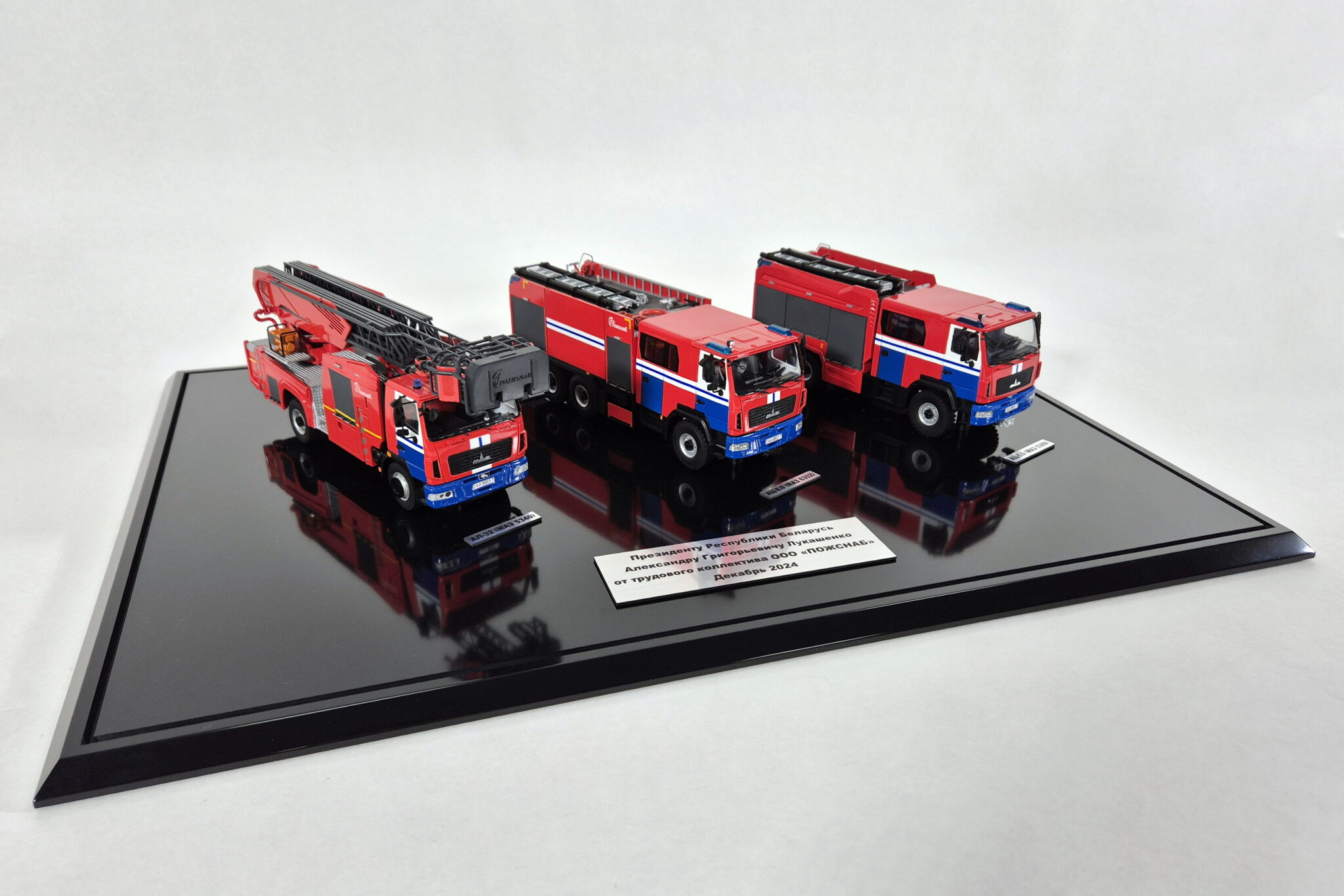 На подставке расставлены модели АЛ-32 на шасси (МАЗ 5340), АЦ-8.0 на шасси (МАЗ 6302), АЦ-5.0 на шасси (МАЗ 5309).