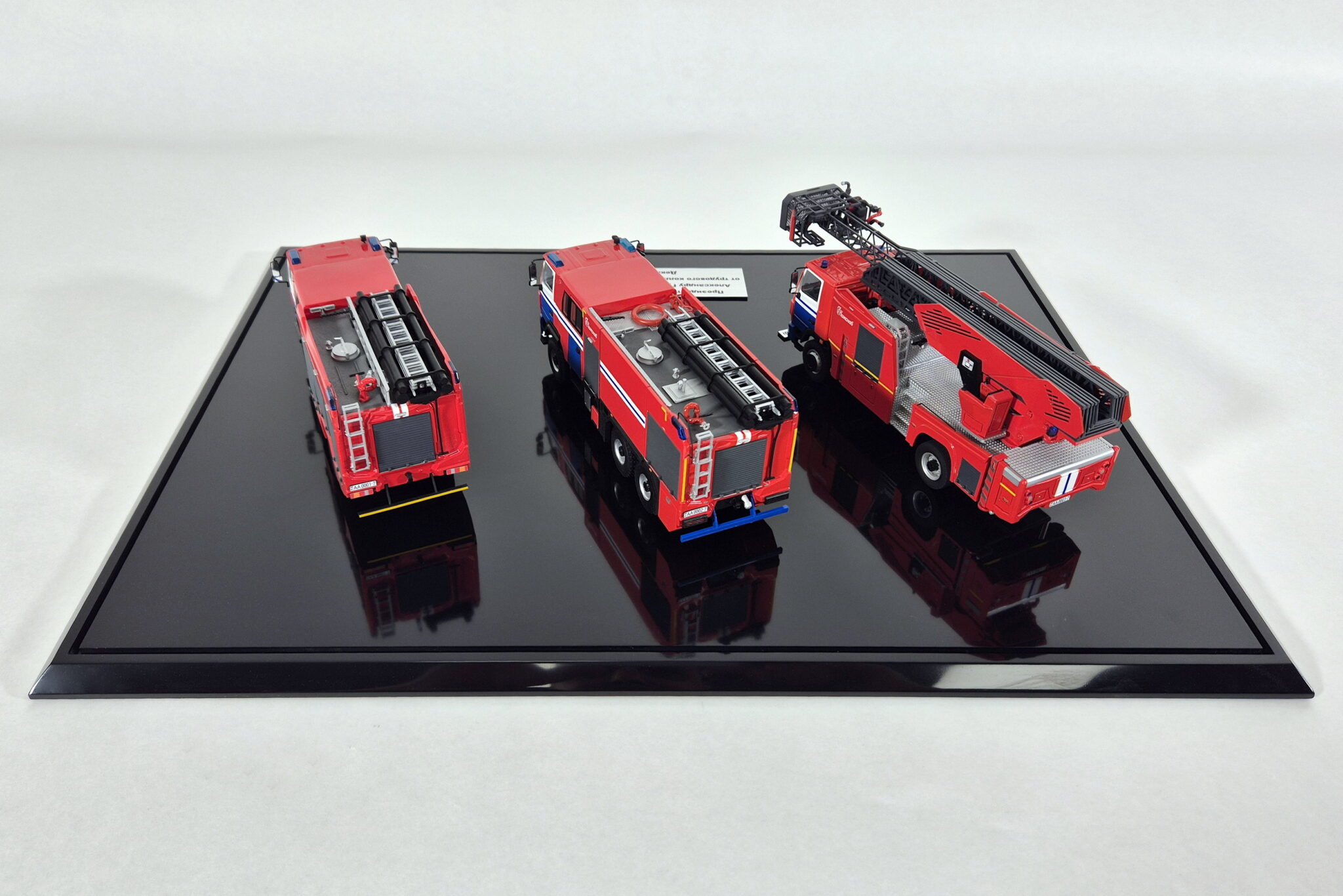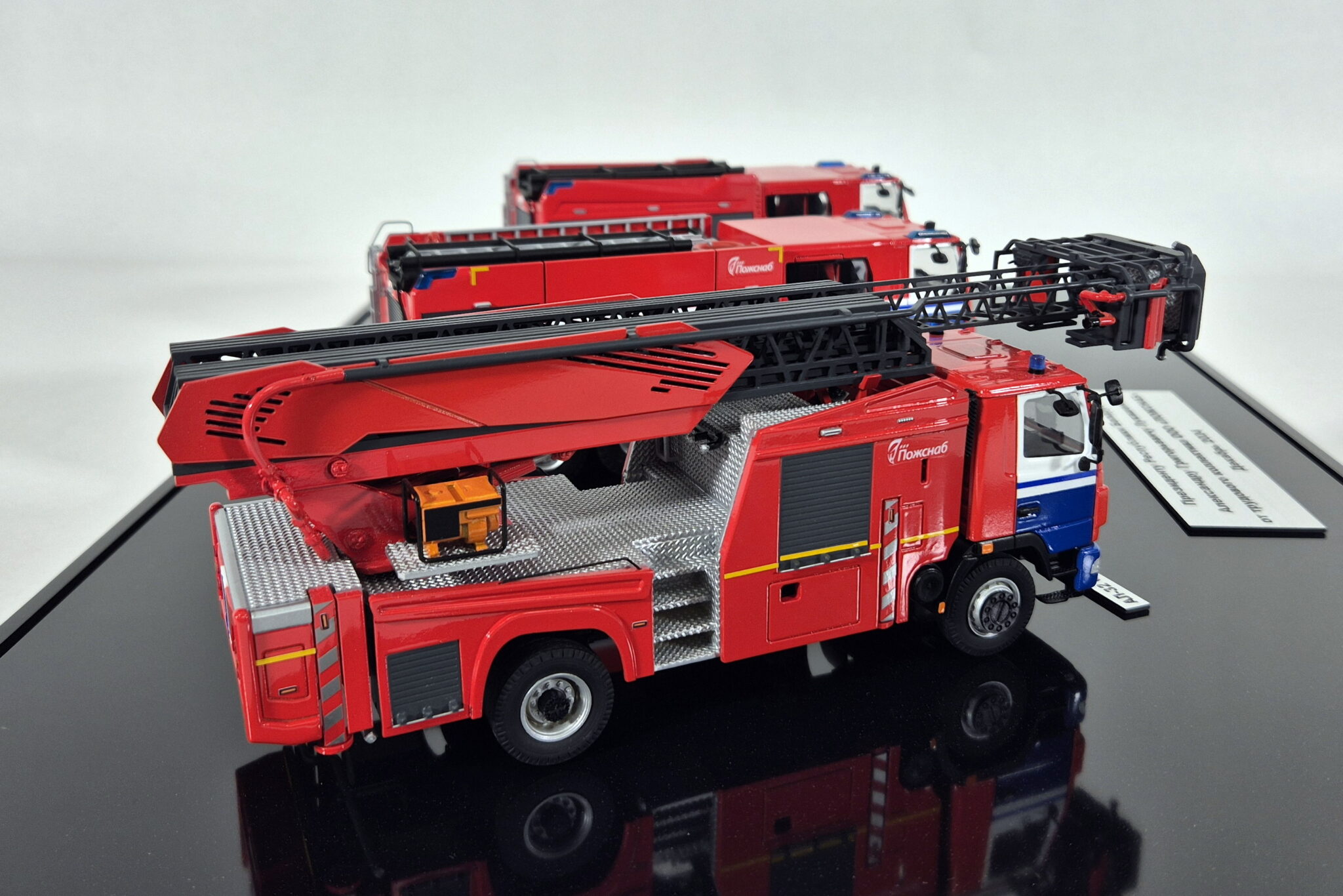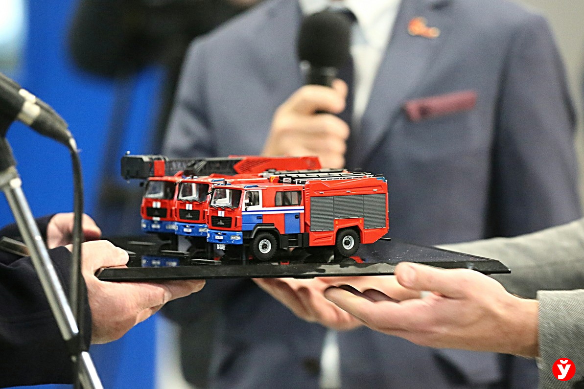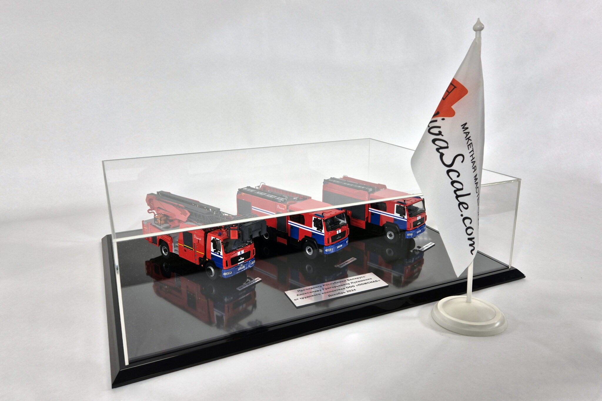 На подставке расставлены модели АЛ-32 на шасси (МАЗ 5340), АЦ-8.0 на шасси (МАЗ 6302), АЦ-5.0 на шасси (МАЗ 5309).