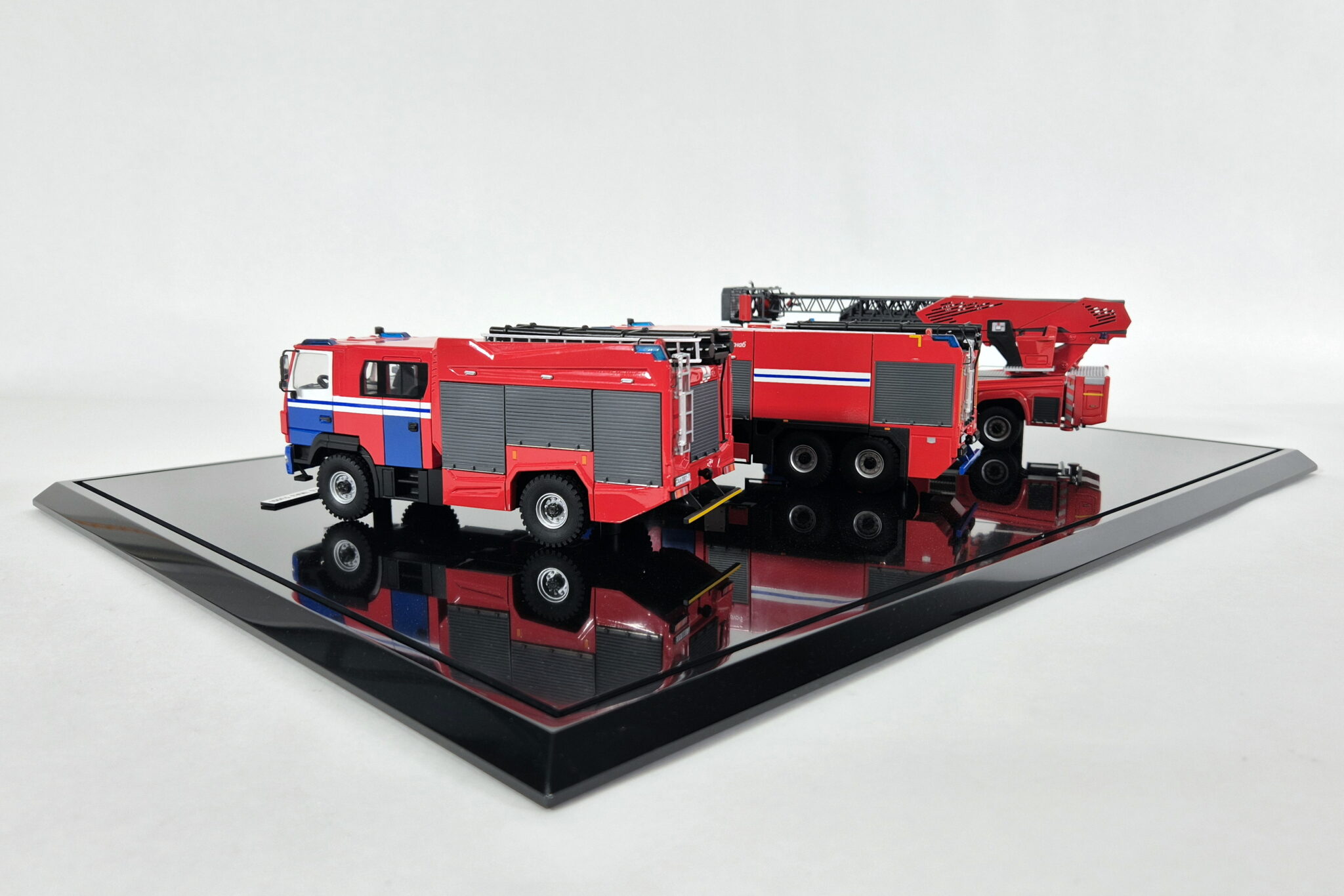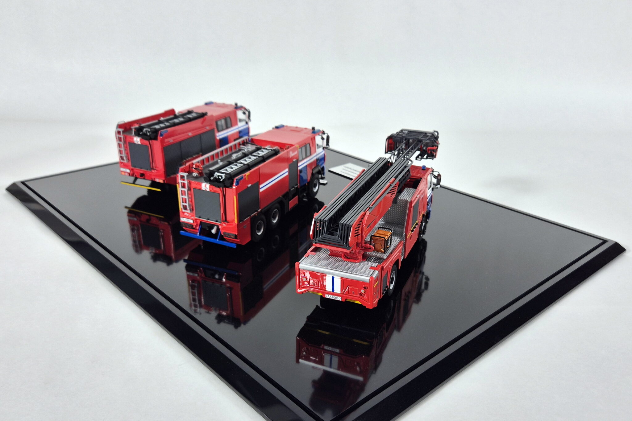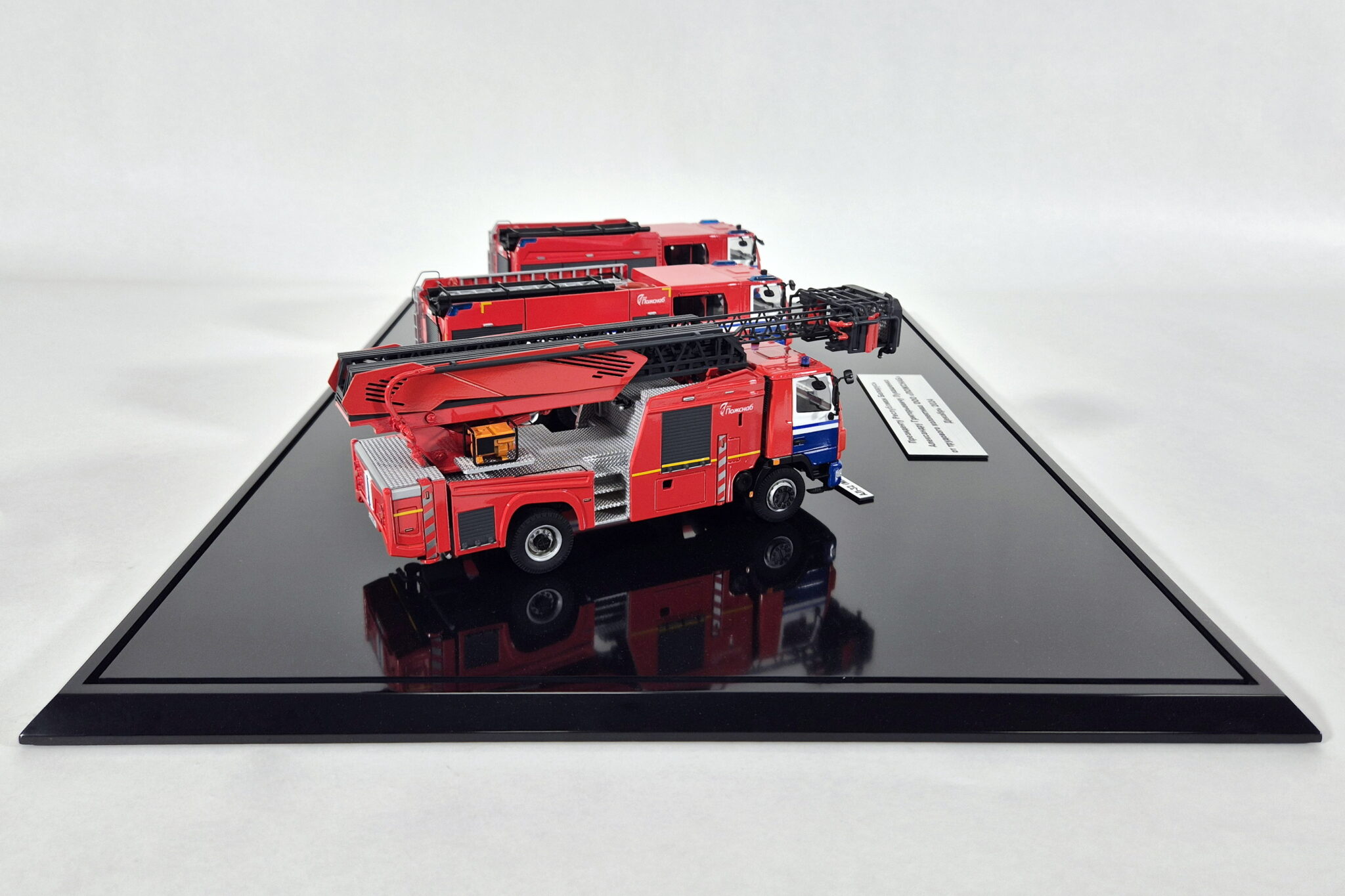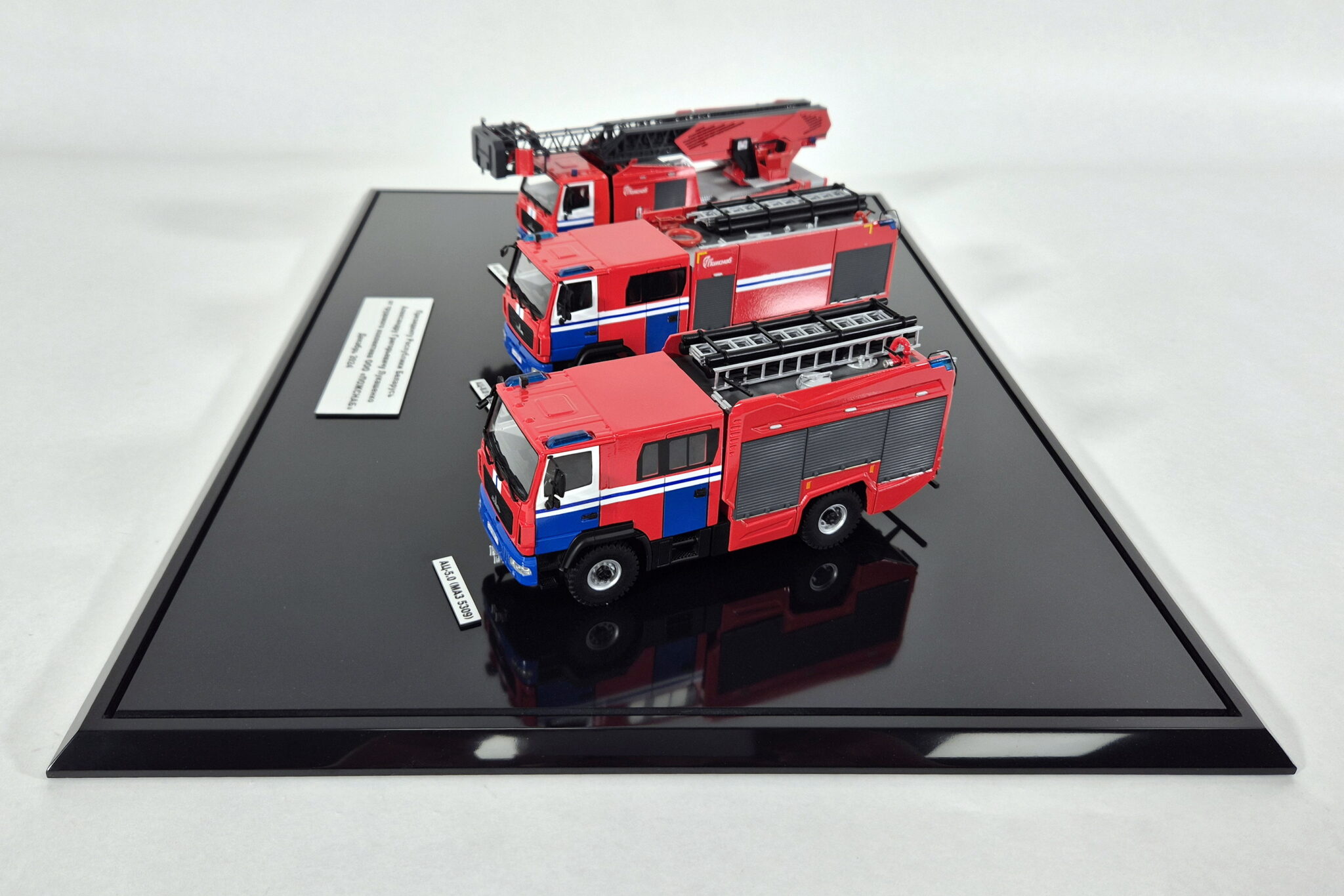 На подставке расставлены модели АЛ-32 на шасси (МАЗ 5340), АЦ-8.0 на шасси (МАЗ 6302), АЦ-5.0 на шасси (МАЗ 5309).
