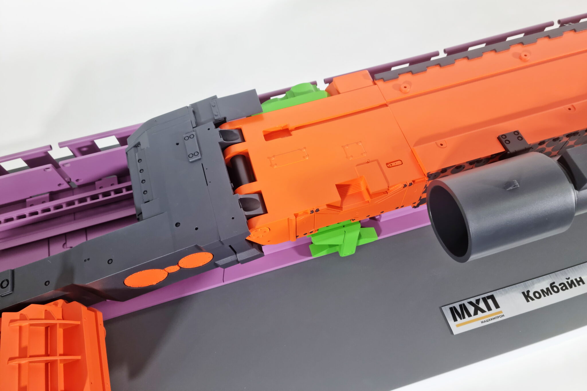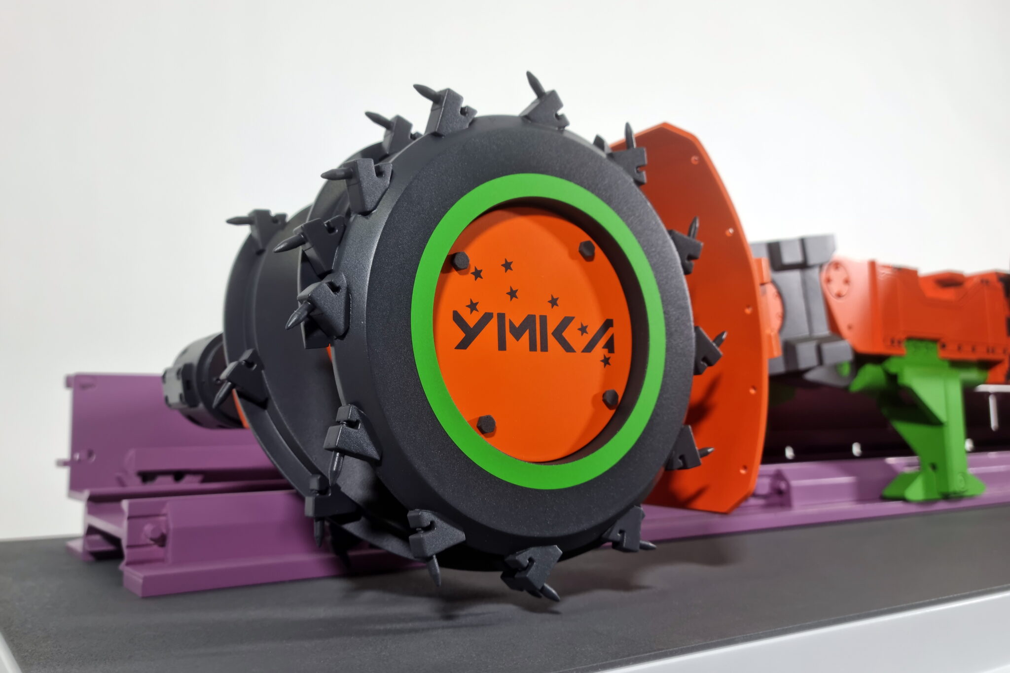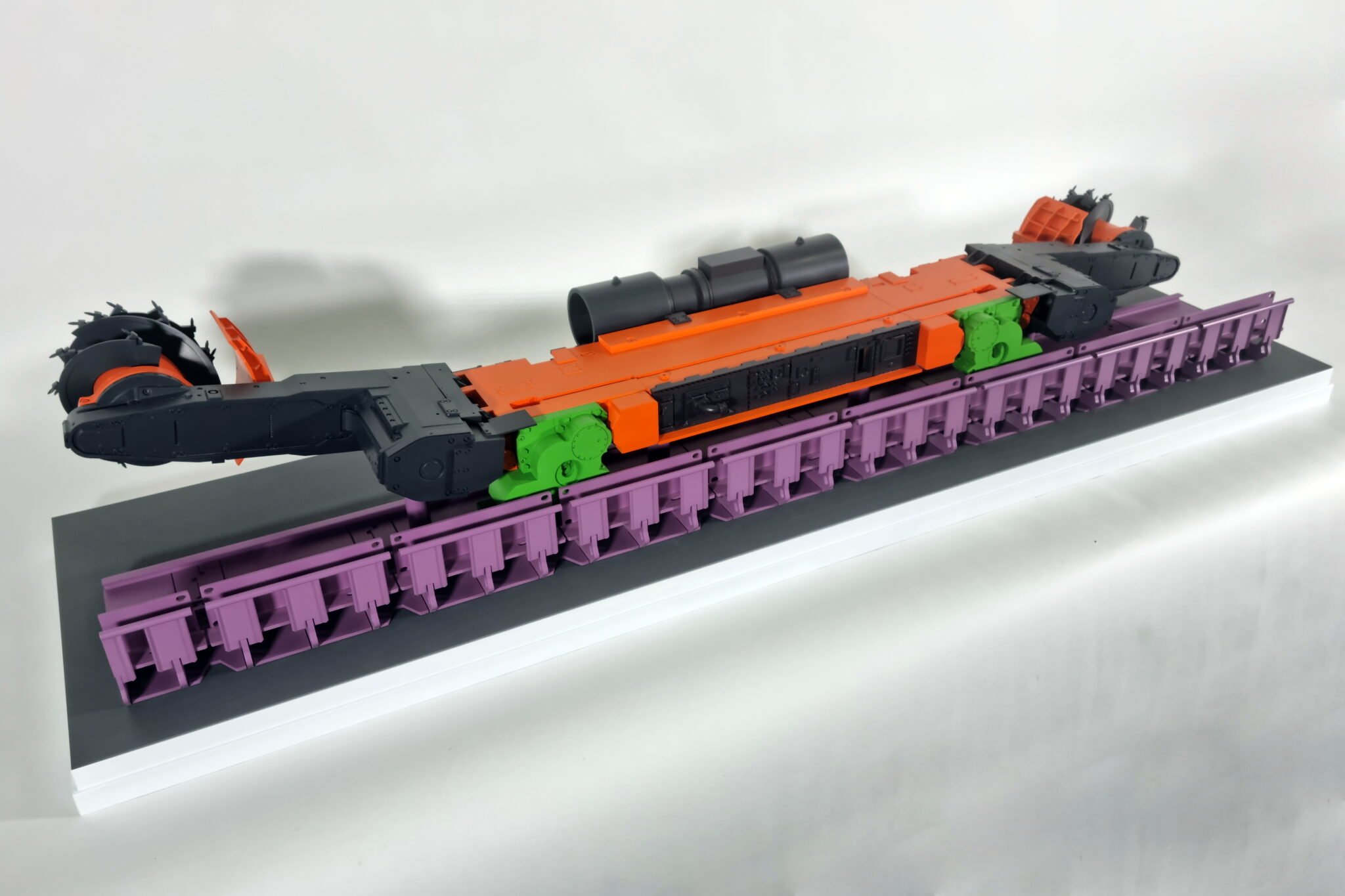 Выставочный макет очистного комбайна для выемки пласта по челночной или односторонней схеме работы.-